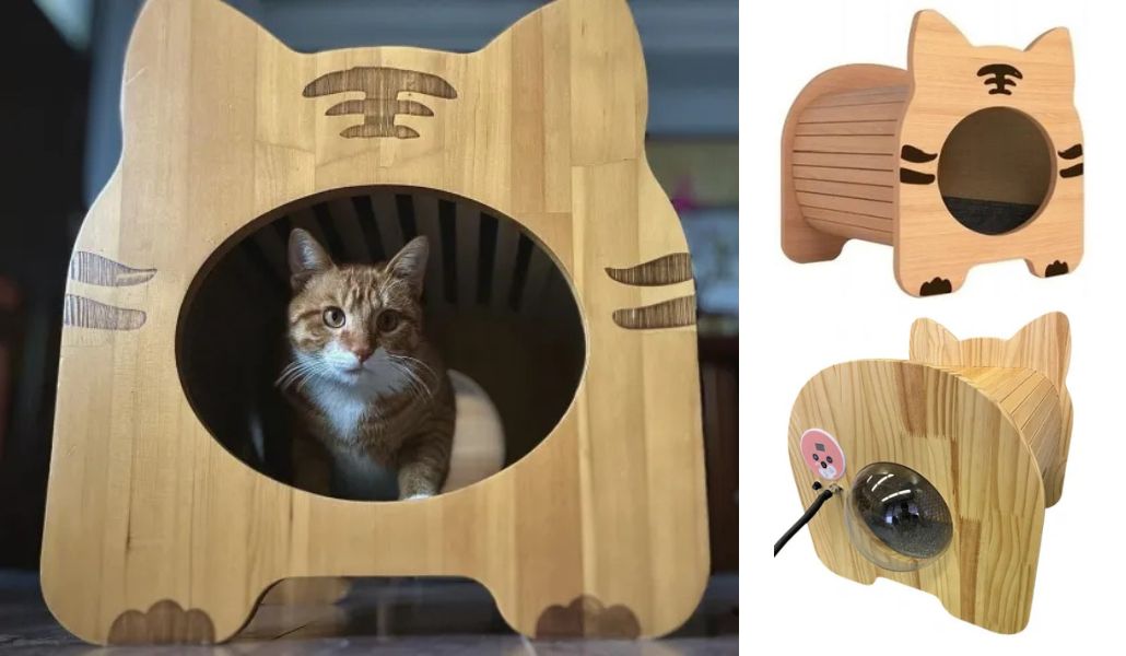 Fabricada con madera natural hemlock canadiense y pino, la casita permite mantener una temperatura interior regulable entre 20 y 32°C, sin generar vapor. Cuenta con un mecanismo de seguridad que detiene automáticamente el calentamiento si la temperatura interna supera los 39°C, para evitar sobrecalentamientos. Además, incluye una superficie interior para que los gatos puedan afilar sus uñas.