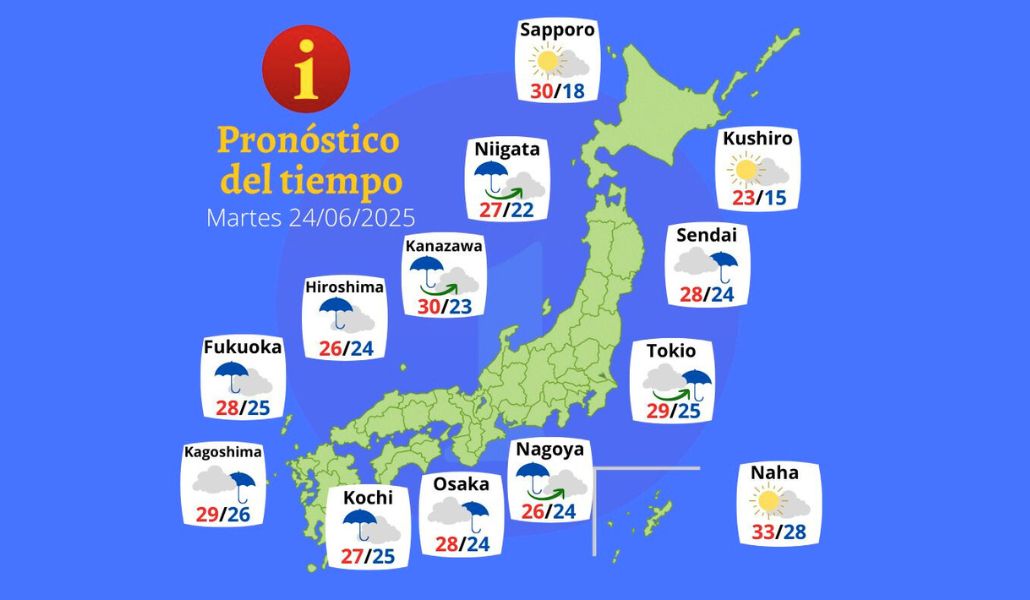 El martes 24 de junio, se espera que el frente estacionario de lluvias continúe afectando gran parte del archipiélago japonés, especialmente desde Kyushu hasta la región de Tokai, donde se prevén lluvias intensas acompañadas de tormentas eléctricas. Las autoridades piden precaución ante posibles inundaciones repentinas y el aumento del caudal de los ríos.