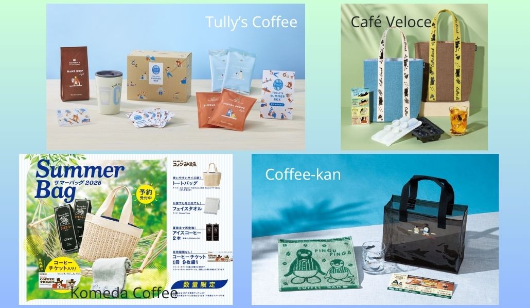 Por su parte, Komeda Coffee apuesta por la estética veraniega con un set que incluye bolsa tipo sombrero de paja, toalla facial, café frío sin azúcar y nueve vales sin fecha de vencimiento. Disponible desde el 14 hasta el 21 de julio, los precios varían según la tienda, entre 5.000 y 6.100 yenes.