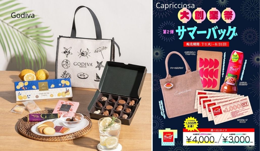 En el sector de la cocina italiana, Capricciosa celebra sus 47 años con una bolsa que incluye espaguetis ilustrados, tés originales, aderezos y vales de comida. Se puede adquirir entre julio y agosto por 3.000 o 4.000 yenes, según la versión.