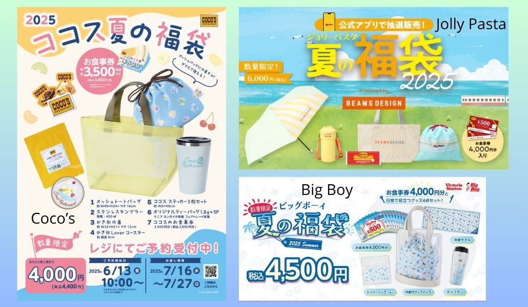 Por primera vez, Big Boy se une al mercado de verano con una propuesta familiar: una bolsa con productos de temporada como bolsas transparentes, vasos térmicos, toallas refrescantes y vales por 4.000 yenes en consumo, a un precio final de 4.500 yenes. Disponible por sorteo.