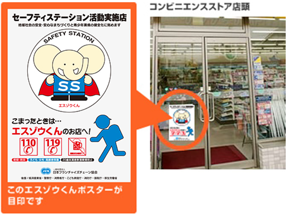 La campaña es promovida por siete cadenas de tiendas de conveniencia afiliadas a la Asociación de Cadenas de Franquicias de Japón (JFA), incluyendo Seven-Eleven, FamilyMart y Lawson. Un póster con la ilustración de un elefante identifica a los establecimientos colaboradores como «Tiendas de Colaboración con el Programa de Estación de Seguridad», y están colocados en prácticamente todas las tiendas de conveniencia del país. Se estima que hay 56.861 tiendas colaboradoras en todo Japón.