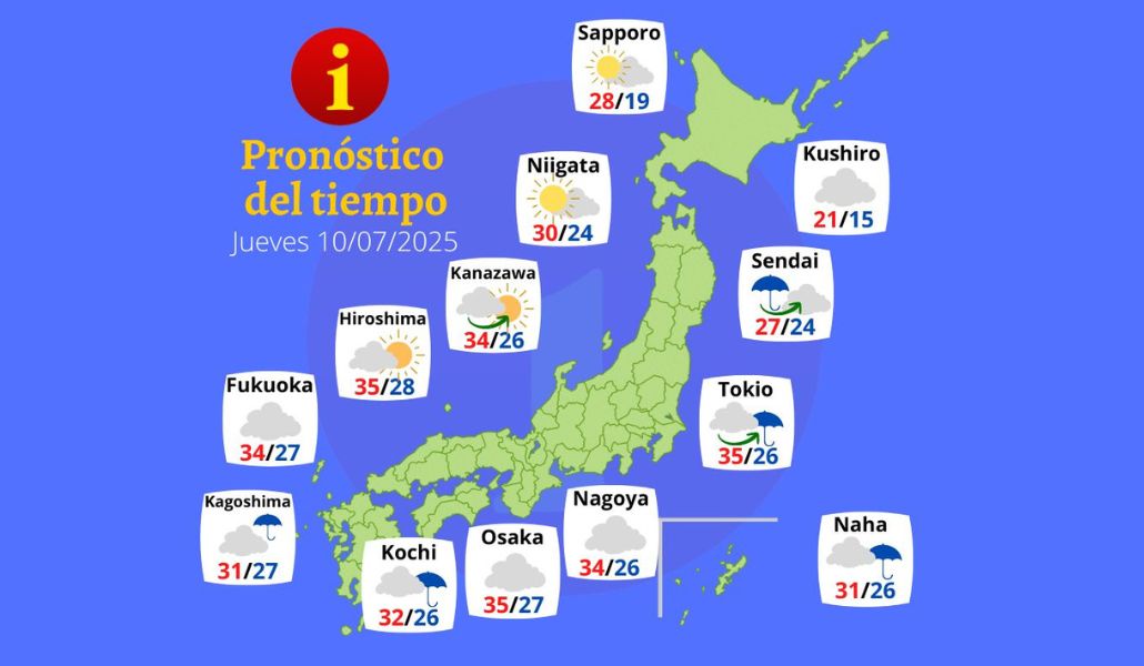 El jueves 10 de julio, se prevé un tiempo inestable en gran parte del país. En la región de Kanto, el avance del frente lluvioso provocará precipitaciones desde horas de la mañana en el norte, y a partir de la tarde en el sur. En algunas zonas, se esperan lluvias intensas con descargas eléctricas. Tras el paso de la lluvia, las temperaturas tenderán a descender.