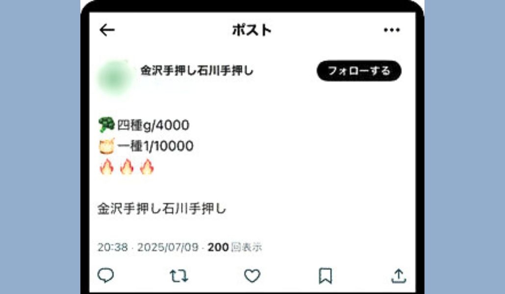 Por ejemplo, una publicación con el texto «Brócoli, 2 tipos 1/5000″「ブロッコリー2種1/5000」se interpreta como “dos tipos de marihuana disponibles, 5.000 yenes por gramo”. Términos como «Sumo de empujones con las manos»「手押し相撲(ておしずもう)」indican que el producto se entrega en mano.