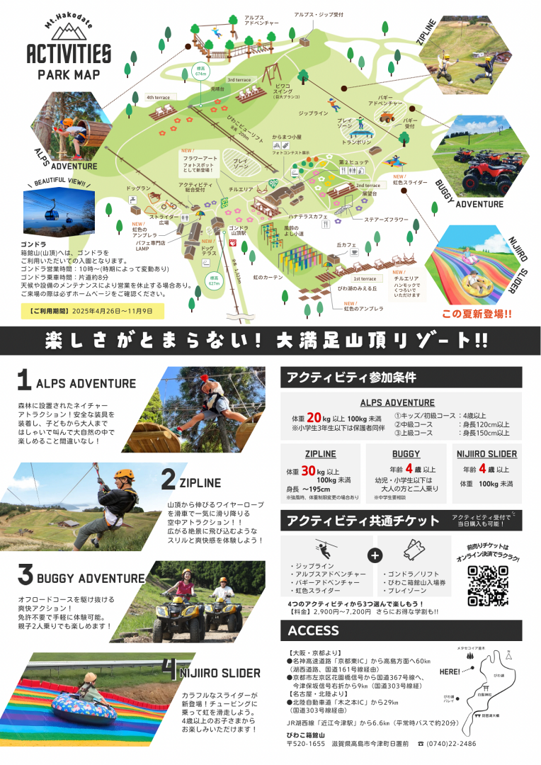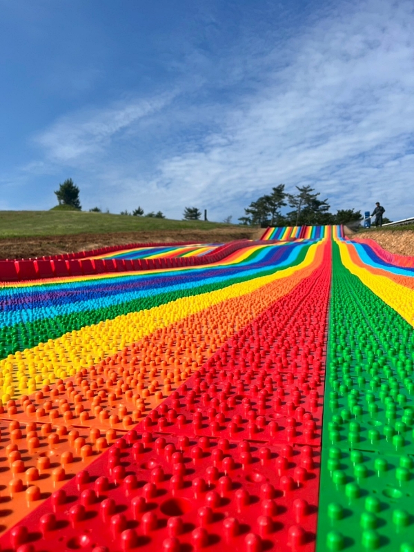 Biwako Hakodateyama no solo es flores y paisajes: su propuesta incluye actividades para todas las edades. Los visitantes pueden disfrutar de la adrenalina de un tobogán arcoíris de 50 metros de largo, un zipline con vistas al lago, recorridos en buggy y otras experiencias que completan una jornada llena de naturaleza, deporte y ocio.