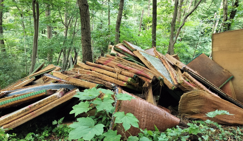 El vertido, calificado por el jefe del departamento, Tomohisa Naruse, como «el más grande» que ha visto, se suma a otros desechos de construcción como hormigón y madera, y hasta detectores de humo. Se cree que los responsables utilizaron camiones volquete para arrojar los escombros y tatamis de una sola vez desde las áreas de descanso del camino forestal.