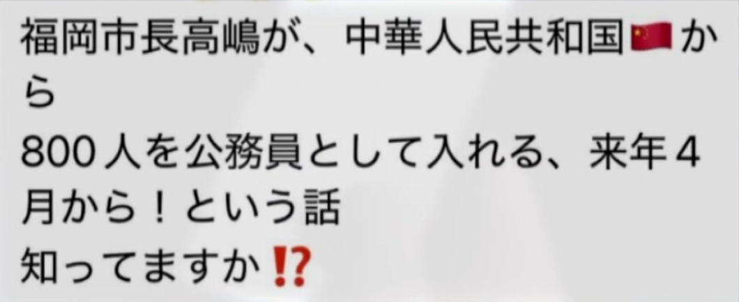El alarmante mensaje, publicado en redes sociales el 29 de septiembre, preguntaba a los residentes: «¿Saben que el alcalde de Fukuoka, Takashima, va a contratar a 800 personas de la República Popular China como funcionarios públicos!?».