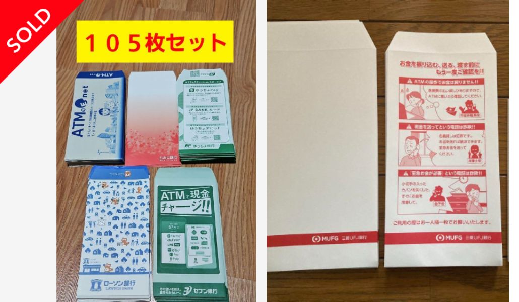 Una búsqueda de “sobres de banco” en Mercari revela numerosos anuncios de sobres de Japan Post Bank y de bancos regionales. Un paquete de 40 sobres nuevos llegó a venderse por 300 yenes, mientras que modelos con personajes de videojuegos alcanzaron los 1.100 yenes por 20 unidades, debido a su carácter coleccionable. Incluso en Yahoo! Auctions se registraron ventas de sobres en grandes cantidades, algunas agrupadas como colecciones completas de bancos regionales.