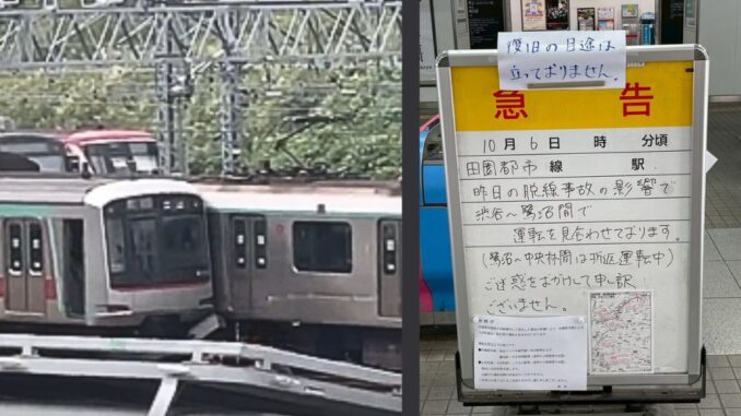 Un accidente ferroviario se produjo la noche de ayer en la estación Kajigaya, en Kawasaki, de la línea Den-en-toshi de Tokyu, cuando dos trenes colisionaron y uno de ellos se descarriló, según informó la compañía Tokyu Railway. No se reportaron heridos. La reanudación del servicio en toda la línea aún no tiene horario confirmado.