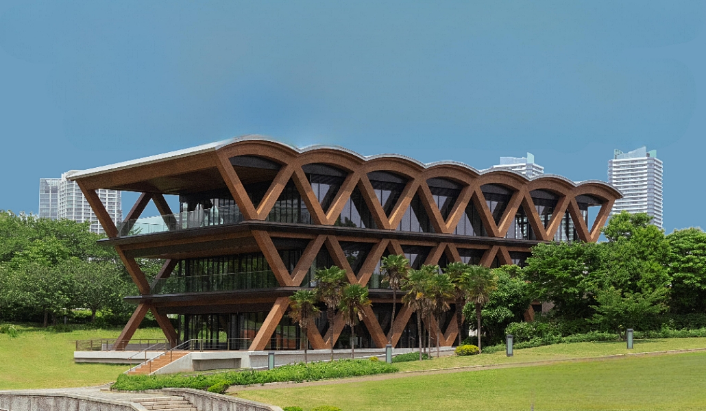 El Yokohama Timber Wharf es un complejo de tres pisos con funciones de café y apoyo a la recreación al aire libre, estratégicamente ubicado en el Parque Rinko, la mayor zona verde del distrito Minato Mirai 21. Su arquitectura es distintiva, con una fachada completamente revestida de madera y una construcción de celosía que le otorga una composición única y espectacular.