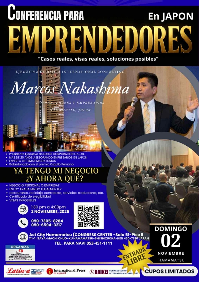 La comunidad empresarial hispana en Japón recibirá un apoyo crucial con la realización de la conferencia «Emprendedores en Japón: Ya tengo mi negocio ¿y ahora qué?». El evento, de entrada libre y cupos limitados, tiene como objetivo guiar a profesionales y empresarios en el complejo proceso de establecer y legalizar negocios en el territorio japonés.