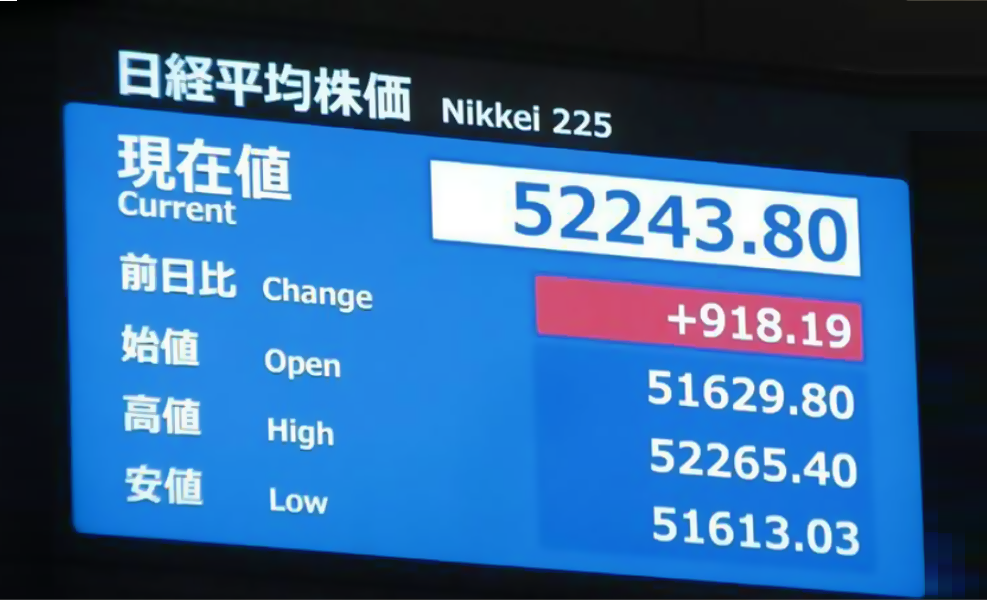 El índice Nikkei 225 alcanzó hoy viernes por primera vez en la historia la marca de los 52.000 puntos durante la sesión matutina en la Bolsa de Tokio, impulsado por la depreciación del yen frente al dólar y los sólidos resultados empresariales tanto en Japón como en Estados Unidos. A las 10:00 de la mañana, el Nikkei se situaba en 52.187 yenes, con una ganancia de 862 yenes respecto al cierre del día anterior, y llegó a registrar un alza momentánea superior a los 1.000 yenes.