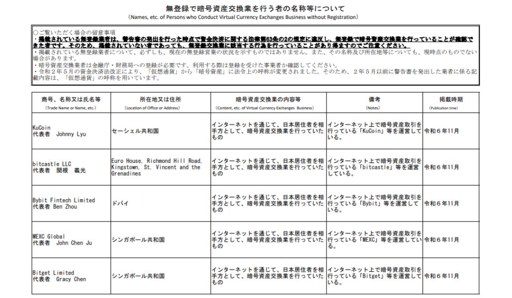La Agencia de Servicios Financieros de Japón (Financial Services Agency, FSA) mantiene una lista de empresas advertidas por operar como intercambios de criptomonedas sin registro, en violación del artículo 63-2 de la Ley de Liquidación de Pagos. Entre estas empresas figura Bybit Fintech Limited, que, según confirmó CoinDesk JAPAN, recibió advertencias en tres ocasiones: mayo de 2021, marzo de 2023 y noviembre de 2024.