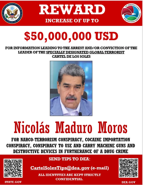 La fiscal general de EEUU, Pam Bondi, al anunciar la recompensa, calificó a Maduro como «uno de los mayores narcotraficantes del mundo y una amenaza para nuestra seguridad nacional». La administración Trump ya ha designado al Cártel de los Soles y al Tren de Aragua como organizaciones criminales transnacionales y terroristas.