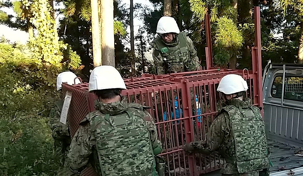 Los soldados transportaron las trampas de caja (hako wana), que pueden pesar hasta 200 kg, ayudaron en su instalación y participarán en su inspección junto a los cazadores locales.