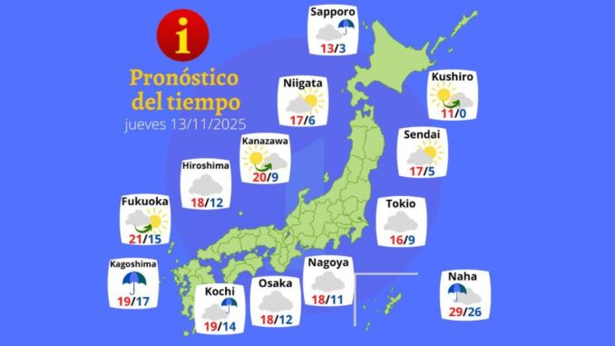 Mañana, jueves 13 de noviembre, Japón experimentará condiciones climáticas variadas debido a la influencia de frentes y la cercanía del tifón 26. Las regiones más afectadas serán Okinawa y Amami, donde se espera lluvia intensa y riesgo de inundaciones localizadas. Las autoridades advierten sobre posibles desbordes en carreteras, anegamiento en terrenos bajos y deslizamientos de tierra. La humedad y el calor traerán una sensación de bochorno en estas zonas.