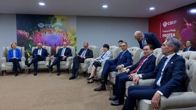líderes de Japón, Canadá y las principales naciones europeas emitieron hoy una declaración conjunta, durante la Cumbre del G20 en Sudáfrica, para manifestar su profunda preocupación por el nuevo plan de paz liderado por Estados Unidos destinado a poner fin a la invasión rusa de Ucrania. Los mandatarios señalaron que la propuesta, al incluir limitaciones al tamaño de las fuerzas armadas ucranianas, podría dejar al país «vulnerable a futuros ataques».