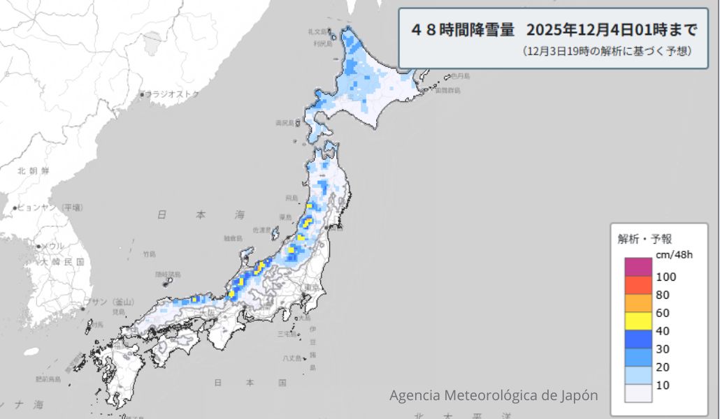La Agencia Meteorológica de Japón advirtió que hasta la mañana de este jueves se prevén intensas nevadas y fuertes vientos en amplias zonas del país, debido a un sistema de baja presión que se desplaza rápidamente hacia el norte.