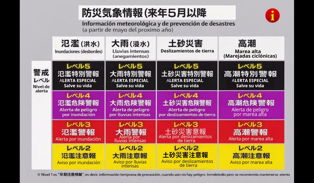 Estos niveles estarán unificados en su denominación y ordenados de mayor a menor gravedad. El Nivel 5 corresponderá a la “alerta especial” (特別警報tokubetsu keiho), mientras que el Nivel 2 se identificará como “aviso” (注意報 chuiho). El Nivel 1 quedará definido como “información de atención temprana”, destinada a reforzar la vigilancia inicial ante posibles riesgos.