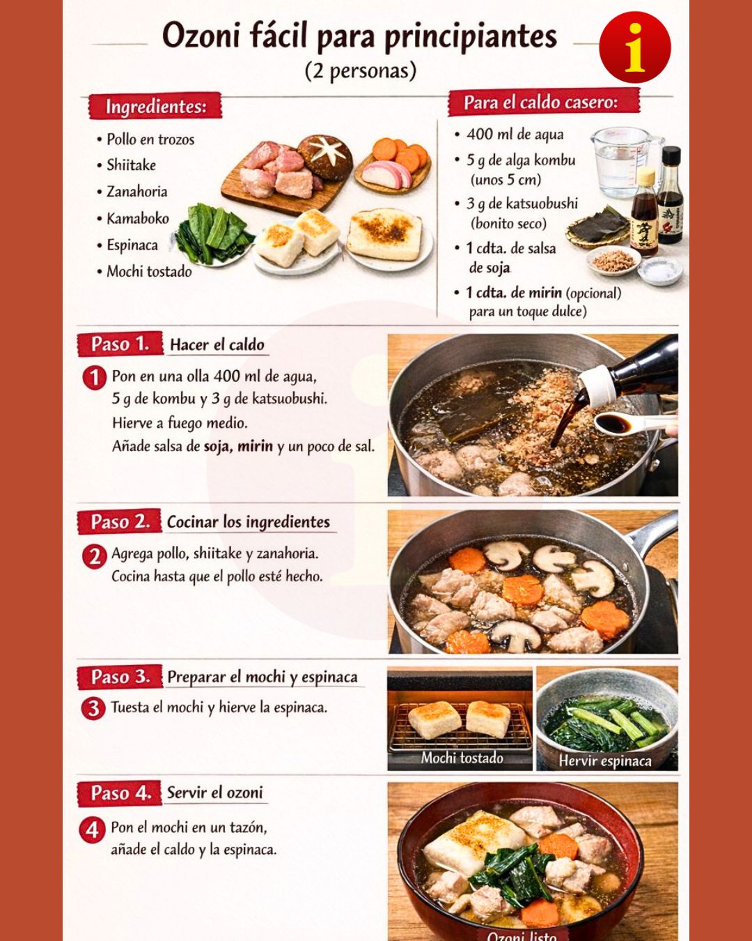 ¿Nunca has preparado Ozoni? No te preocupes: esta receta está pensada para principiantes y es muy sencilla de seguir. Con pocos ingredientes y pasos claros, podrás disfrutar de la tradicional sopa japonesa de Año Nuevo en casa.