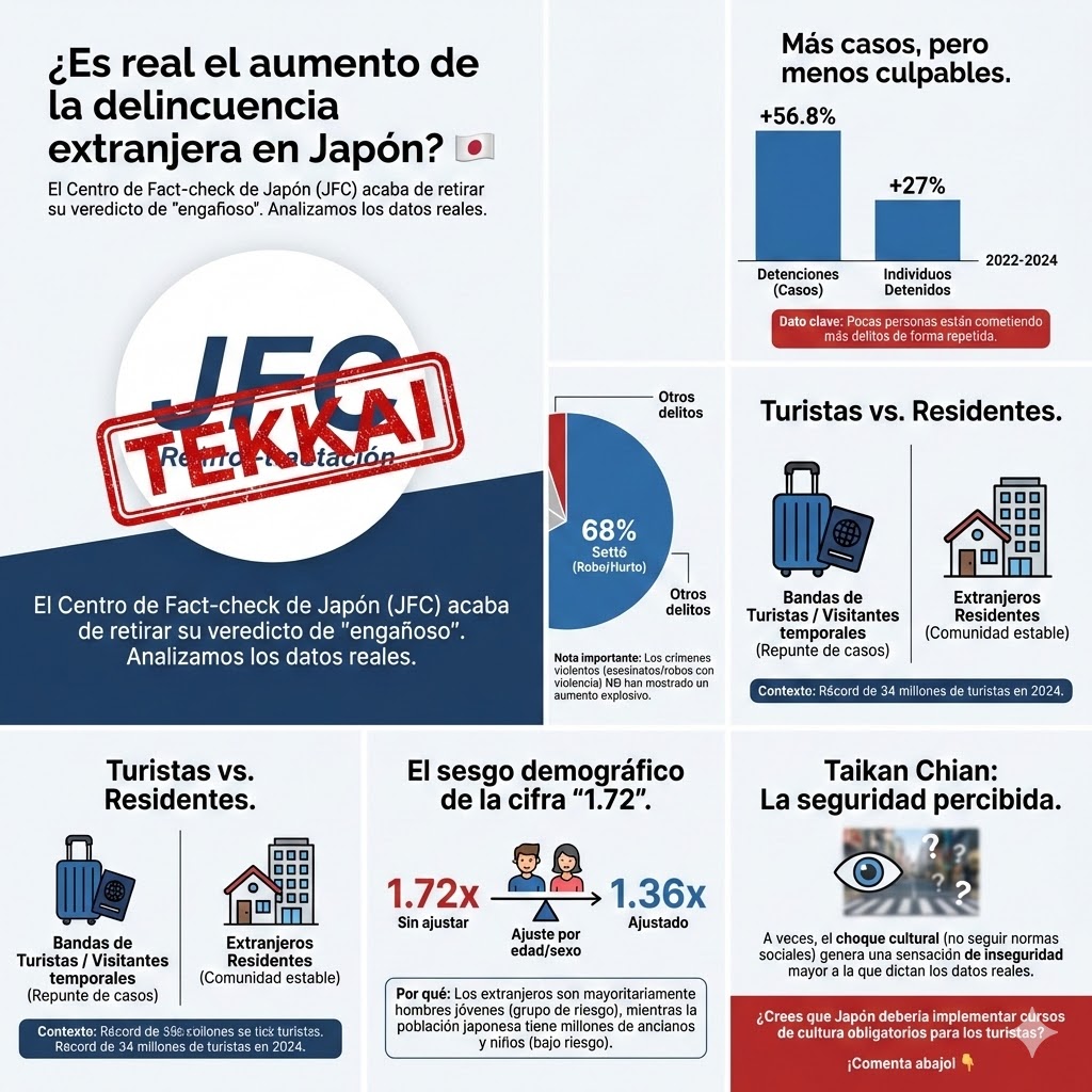 El Nihon Fact-check Center (JFC) —la principal organización independiente de verificación de datos en Japón— anunció una «rectificación» o Tekkai en su veredicto sobre la información de la criminalidad extranjera. Tras calificar inicialmente como «engañosas» las alertas sobre el aumento de delitos en su informe de julio de 2025, el organismo retiró el término esta semana y admitió que omitió datos críticos de 2024.