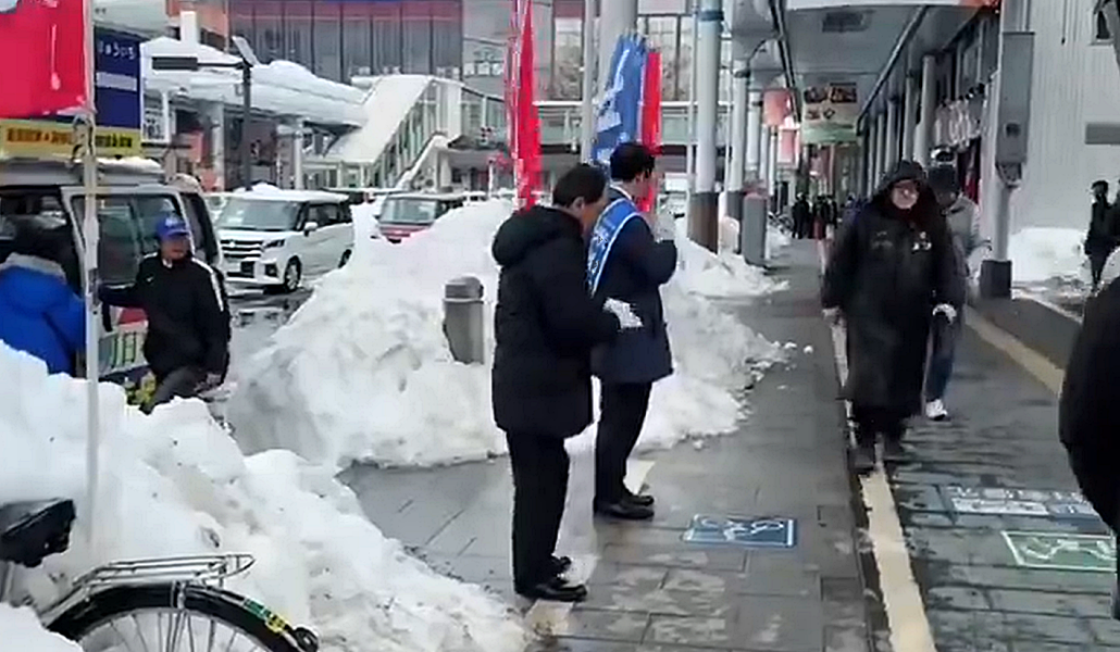 El Ministro de Defensa, Shinjiro Koizumi, hizo campaña en Tokio esta mañana bajo la nieve. «Hace frío, pero mañana será peor. Por favor, vayan a la votación anticipada hoy», suplicó a la multitud presente.