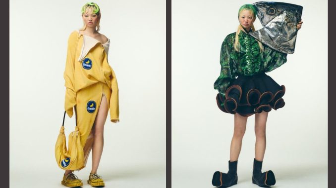 Entre las piezas más llamativas se encuentra la falda con forma de cáscara de banana, que incluye un cierre que se abre como si se pelara la fruta. El tejido está hecho de hilos regenerados de tallos de banana, con un precio de 52.800 yenes. También destacan las faldas de punto con frunces que imitan verduras como lechuga y kikurage, cuyo diseño crea movimiento al caminar y se comercializan por 61.600 yenes.