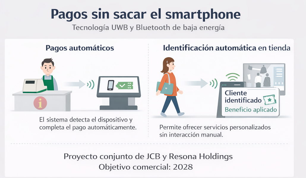 JCB y Resona Holdings desarrollarán un sistema de pago que permitirá comprar sin sacar el smartphone del bolso; prevén comercializarlo en el año fiscal 2028 como alternativa a códigos QR y pagos táctiles.